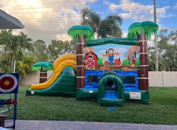 Kids get double the fun with jumping and sliding all in one exciting inflatable.